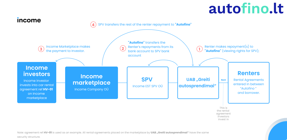 Disclaimer: The Claim is currently not secured by Income´s pledge on the vehicle. A negative pledge has been agreed with Autofino, meaning they cannot dispose or encumber the vehicle without Income´s consent. The Claim may be secured in the future with a collateral established in accordance with the Collateral Agreement over the vehicle for the use of which in return for the Autofinoo has concluded the Rent Agreement with the Client and which is in the ownership of Autofino(the Collateral, as set forth in recital B of the Agreement). The Collateral, when established, will not be assigned to the investor.